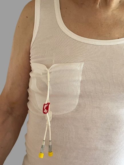 Undertrøjen er designet til at opbevare slanger fra CVK i en lille diskret lomme, når disse ikke benyttes.